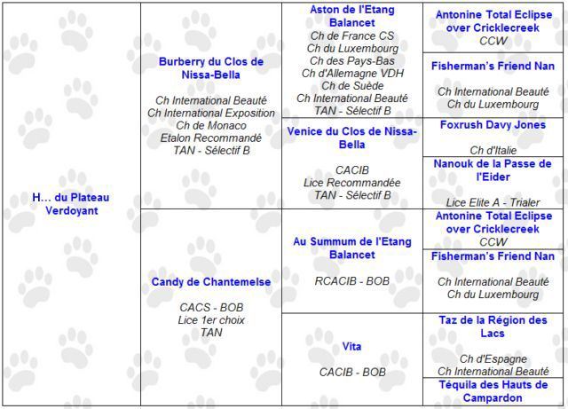 |  | CH Burberry du Clos de Nissa-Bella Champion International de Beauté - Champion de Beauté de Monaco Champion International d'Exposition TAN - Sélectif B - 2 x TB en Field Trial Etalon Recommandé - Elite A (6 points) |