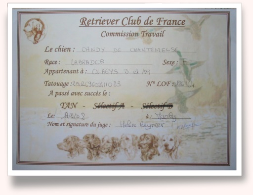 TAN |  | | Candy a passé et obtenu le TAN (Test d'Aptitudes Naturelles) le jour de ses 9 mois ! La Juge était Mme Hélène Reynier. |